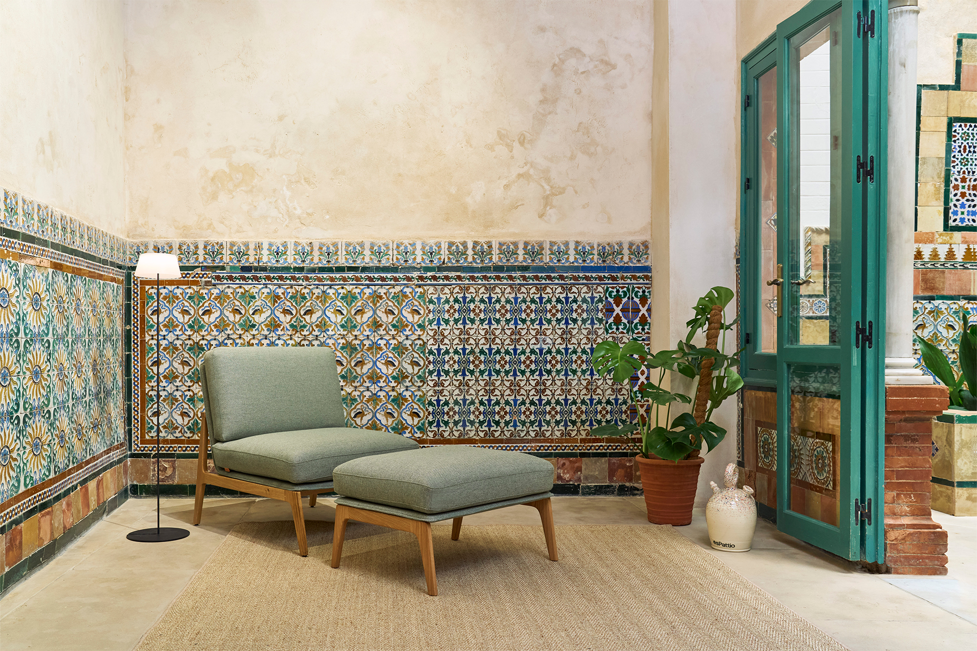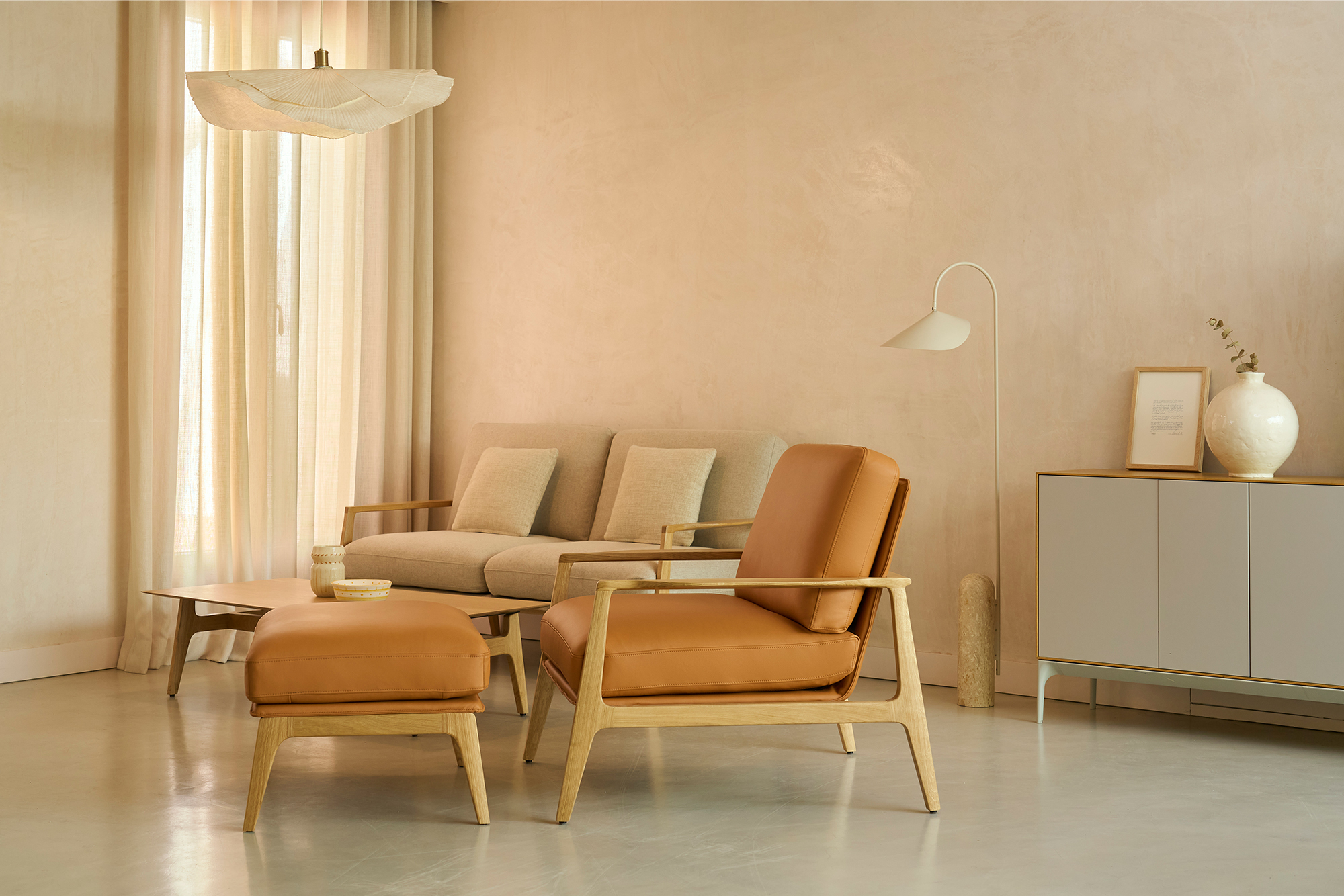 El ottoman de Aldea complementa la colección con sutileza, combinando un diseño sencillo y acogedor que fomenta el confort y la tranquilidad.