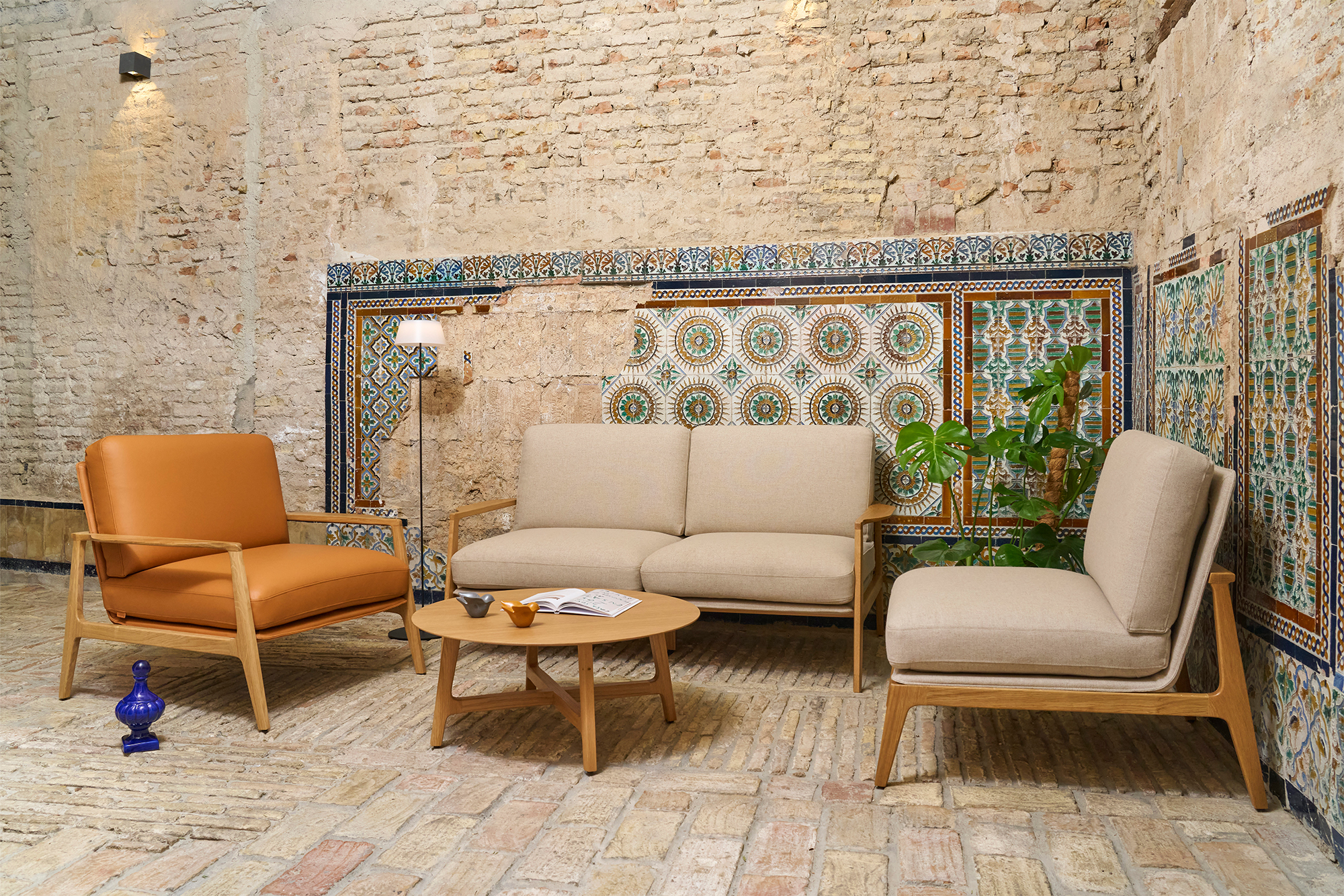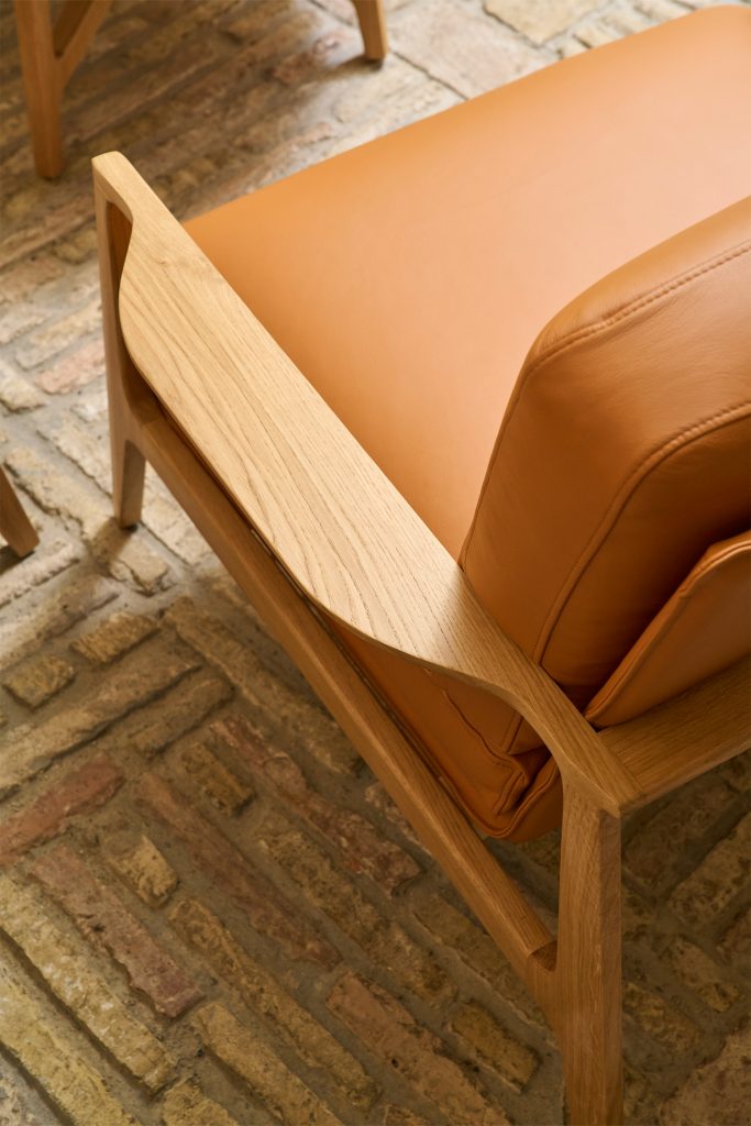 Gracias a su estructura de madera de roble, Aldea aporta una presencia cálida y serena que trasciende lo funcional, dotando a los espacios que habita de una atmósfera refinada que favorece el bienestar y las relaciones humanas.